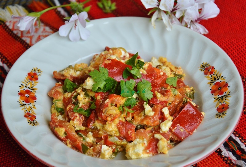 чушки, домати, сирене и яйца, характерно за българската кухня. Съществуват и